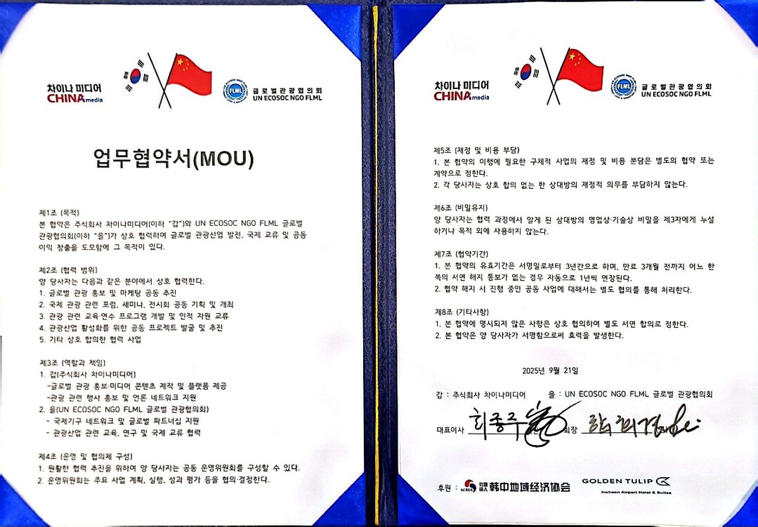 두 기관은 최근 골든튤립 인천공항호텔&스위트에서 업무협약을 체결하고, 영종국제도시를 단순한 관광지가 아닌 국제적 관광·문화·교육의 중심지로 육성하겠다는 비전을 선포했다. 이번 협약은 한중지역경제협회의 후원으로 진행돼 더욱 의미를 더했다.